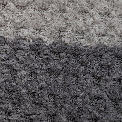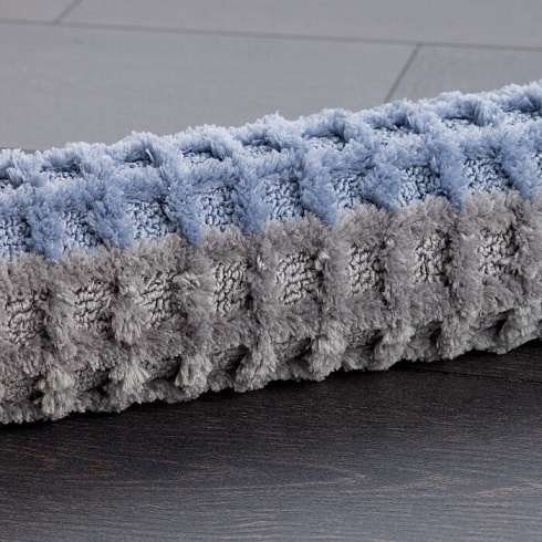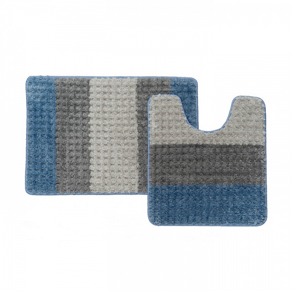 Набор из двух полосатых ковриков для ванной серо-голубого цвета с фигурным ворсом (1,2 см), мягких и очень приятных на ощупь. Ворс из микрофибры отлично держит форму, легко чистится и быстро сохнет. Коврики предназначены для ванной и для туалета (маленький коврик имеет вырез под унитаз).