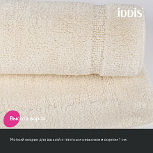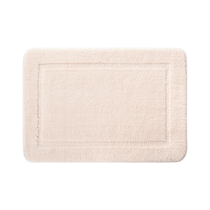 Мягкий коврик для ванной светло-бежевого цвета с плотным невысоким ворсом (1 см), очень приятный на ощупь. Ворс из микрофибры отлично держит форму, легко чистится и быстро сохнет.