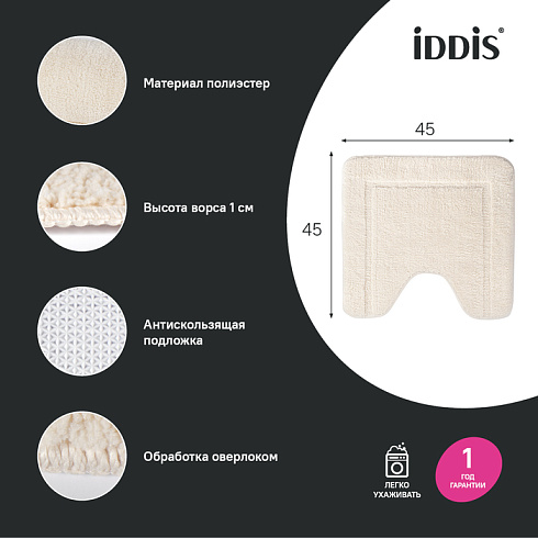 Мягкий коврик для ванной светло-бежевого цвета с плотным невысоким ворсом (1 см), очень приятный на ощупь. Ворс из микрофибры отлично держит форму, легко чистится и быстро сохнет. Коврик имеет вырез под унитаз и предназначен для туалета.