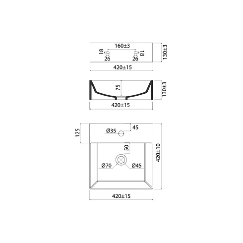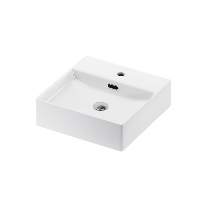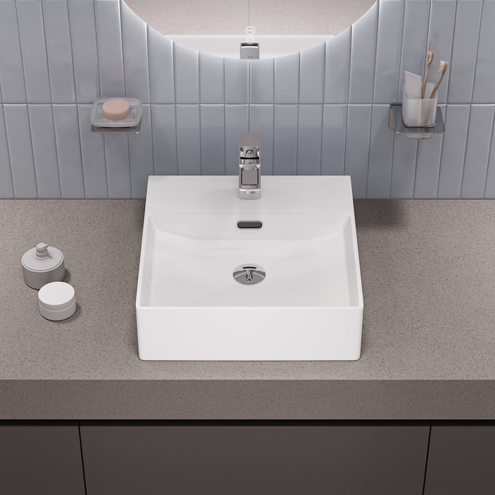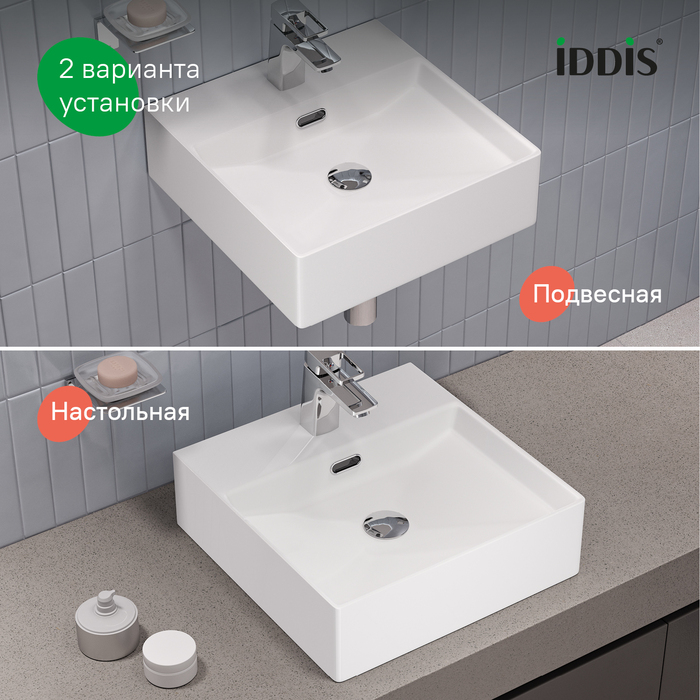 Стильный умывальник Bild для ванной комнаты актуального лаконичного дизайна с удобной полочкой подойдёт к любому современному интерьеру. Размер 420х420х130 мм. Два варианта установки: подвесной и настольный.