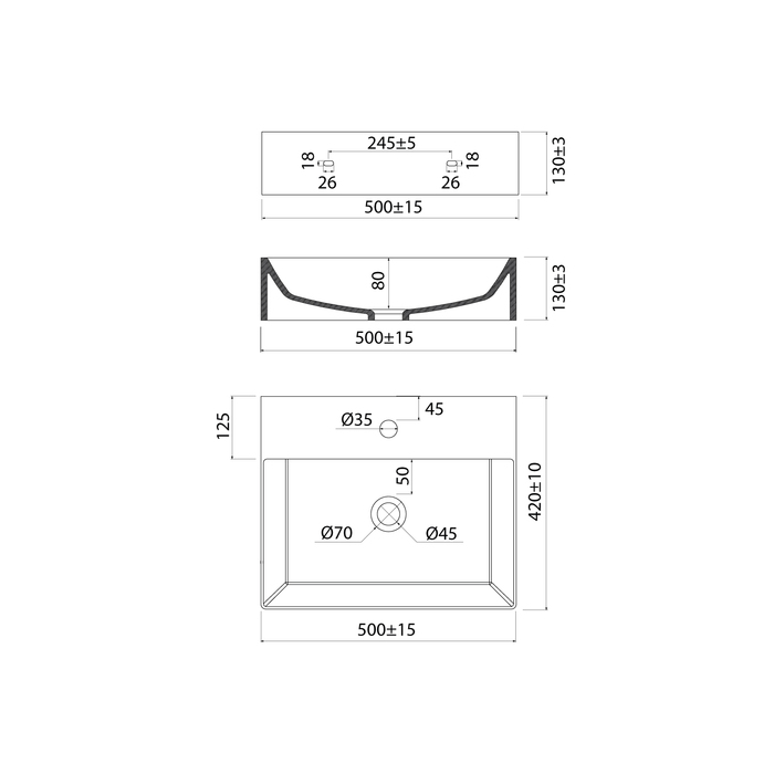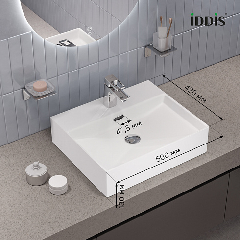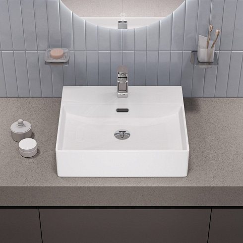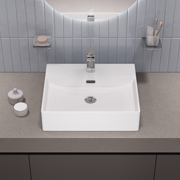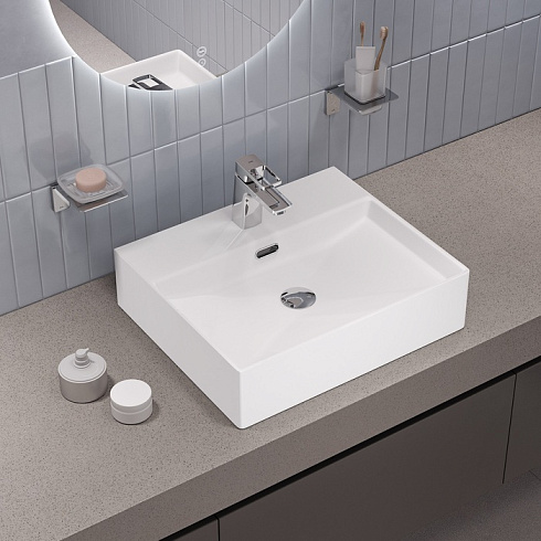 Стильный умывальник Bild для ванной комнаты актуального лаконичного дизайна с удобной полочкой подойдёт к любому современному интерьеру. Размер 500х420х130 мм. Два варианта установки: подвесной и настольный.