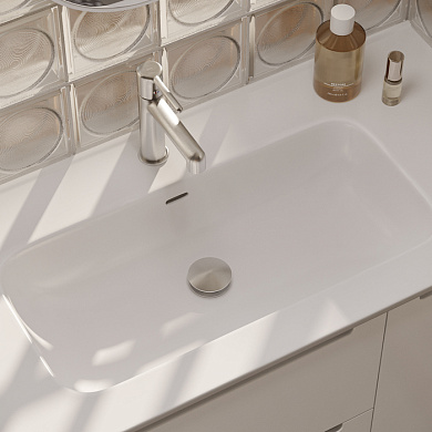 Большой умывальник Slide в белом цвете — идеальное решение для тех, кто выбирает минимализм и чистые формы. С ним так просто обновить интерьер ванной комнаты, не прибегая к масштабному ремонту. Можно собрать готовое решение от IDDIS® в одном цвете: накладной умывальник, смеситель, сифон и выпуск, идеально совпадающие по тону. Это освежит интерьер, сделает его цельным. Смеситель нужно подбирать с учетом высоты чаши.