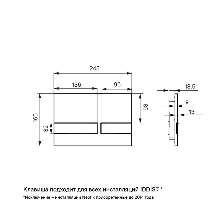 Хромированная клавиша IDDIS® Unifix – модная новинка, которая составит базовый комплект с инсталляцией IDDIS®. Подходит ко всем механическим инсталляциям IDDIS®, кроме инсталляции Neofix в модификации, продававшейся до 2014 года (см. на фото). В ней нет ничего лишнего: только минималистичный дизайн и рельефные кнопки. Благодаря этому клавиша гармонично впишется в любую обстановку ванной комнаты. Плоская и эстетичная клавиша смыва займет пространство размером не более ежедневника (24,5 на 16,5 см). Она легко монтируется и снимается для удобного доступа к крану открытия-закрытия воды и обслуживания арматуры. Данная модель доступна в нескольких цветовых сочетаниях.