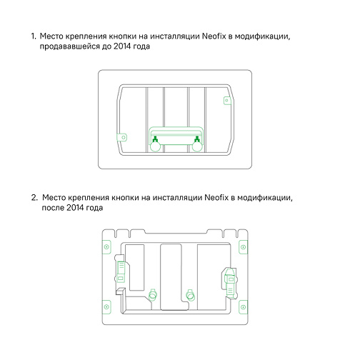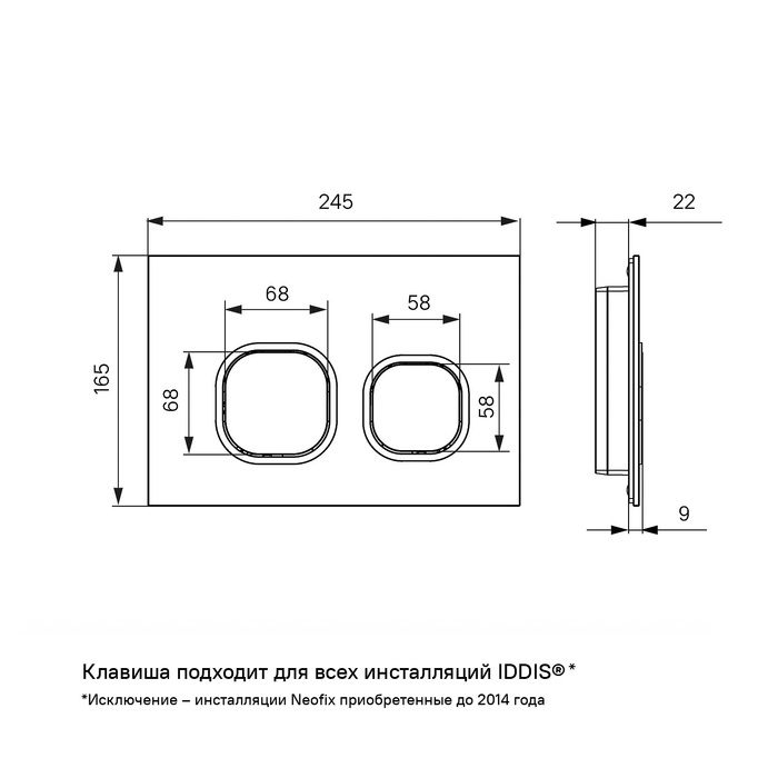 Белая клавиша IDDIS® Unifix составит базовый комплект с подвесной сантехникой – подходит ко всем инсталляциям IDDIS®, кроме инсталляции Neofix в модификации, продававшейся до 2014 года (см. на фото). Черный контур квадратных кнопок оригинально играет на контрастах, превращая функциональный продукт в стильный аксессуар. Плоская и эстетичная клавиша легко монтируется и снимается для удобного доступа к крану открытия-закрытия воды и обслуживания арматуры. Данная модель представлена в нескольких цветовых сочетаниях.