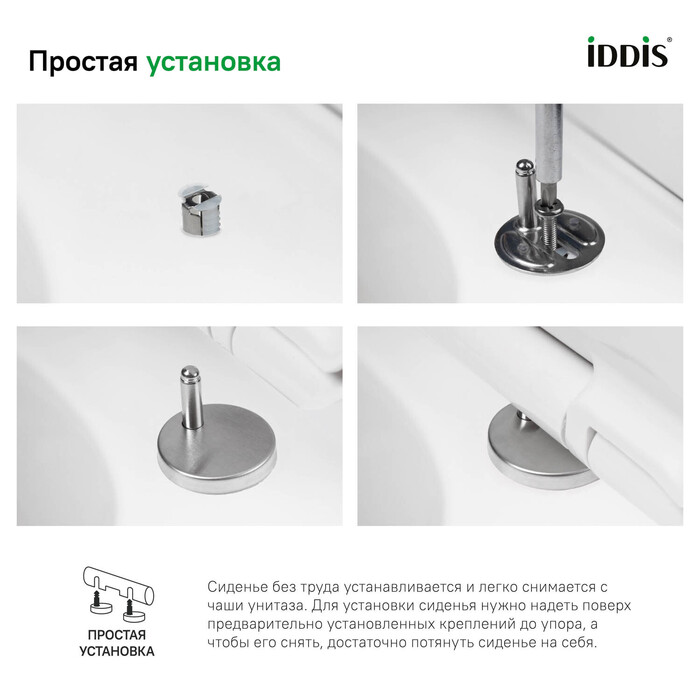 • Благодаря удобным креплениям сиденье легко снимается с чаши на время уборки и без труда устанавливается обратно.