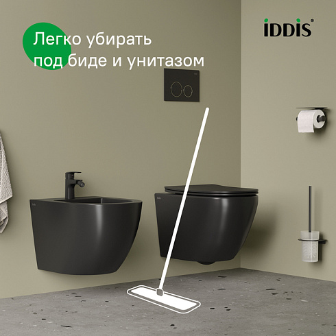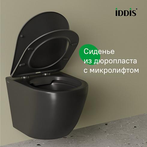 • Безободковая конструкция чаши унитаза и сиденье с микролифтом делают его максимально гигиеничным и удобным. Черное сиденье из матового дюропласта внешне напоминает керамику, устойчиво к царапинам, его легче поддерживать в чистоте. На время уборки сиденье легко снимается с чаши и без труда устанавливается обратно. Подходит к любой инсталляционной системе, оптимальный выбор – IDDIS® (NEO0000I32, PRO0000i32).