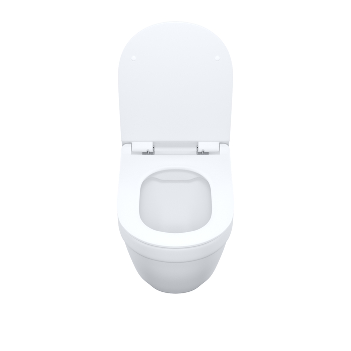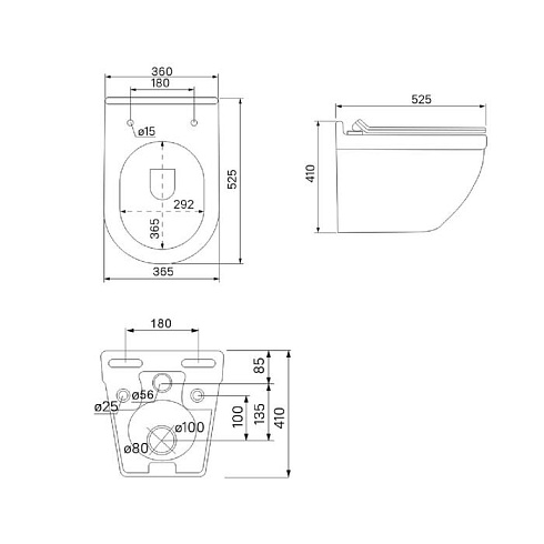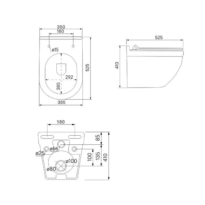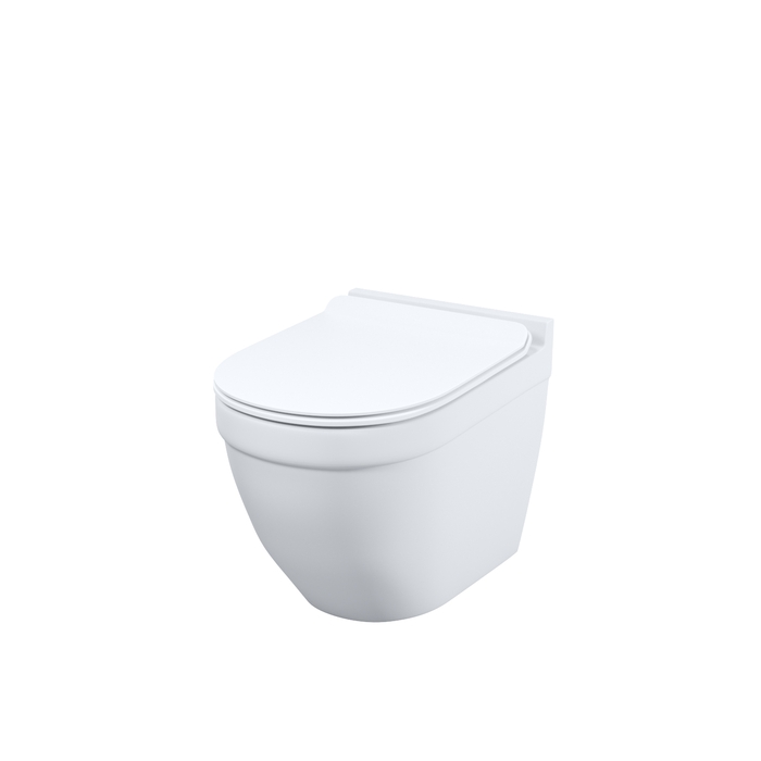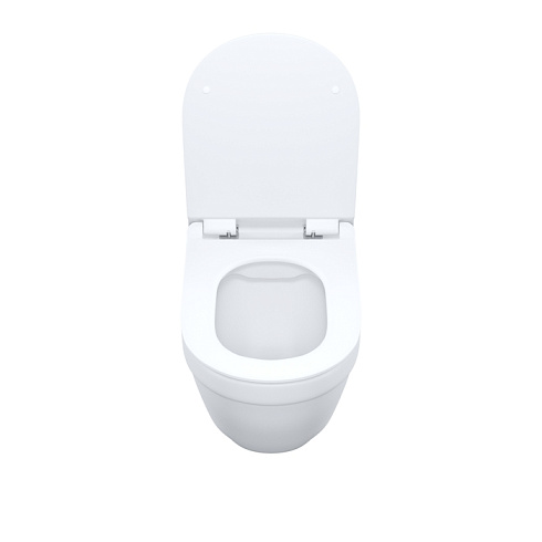 Унитаз подвесной безободковый с сиденьем из дюропласта с функциями Soft Close, Easy Fix. Размер 525х410х360 мм (ДхШхВ). Сиситема скрытых крепежей. Скрытый гидрозатвор. Система антивсплеск. Горизонтальный выпуск, высококачественный санфарфор. Без крепежа. Упаковка: картонная коробка.