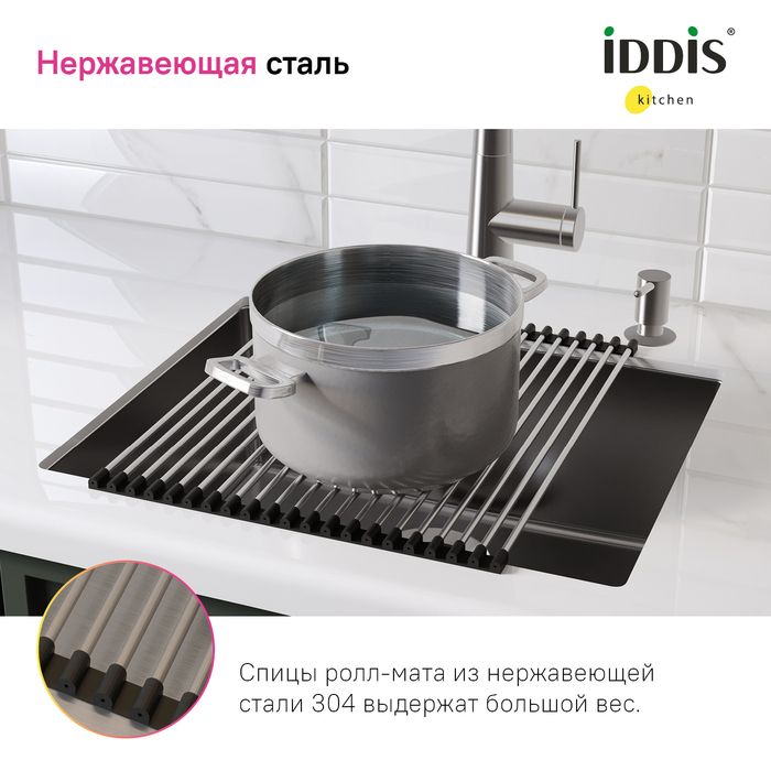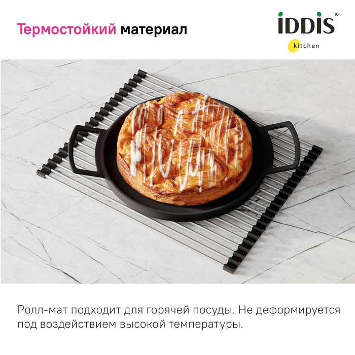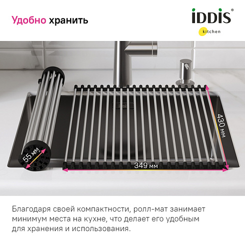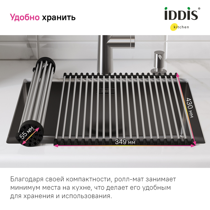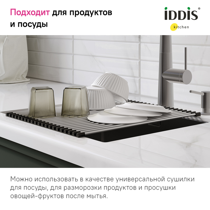 Ролл-мат может использоваться в качестве универсальной сушилки, для разморозки и сушки продуктов, как подставка под горячее. Подходит к кухонным мойкам с шириной чаши от 40 см.