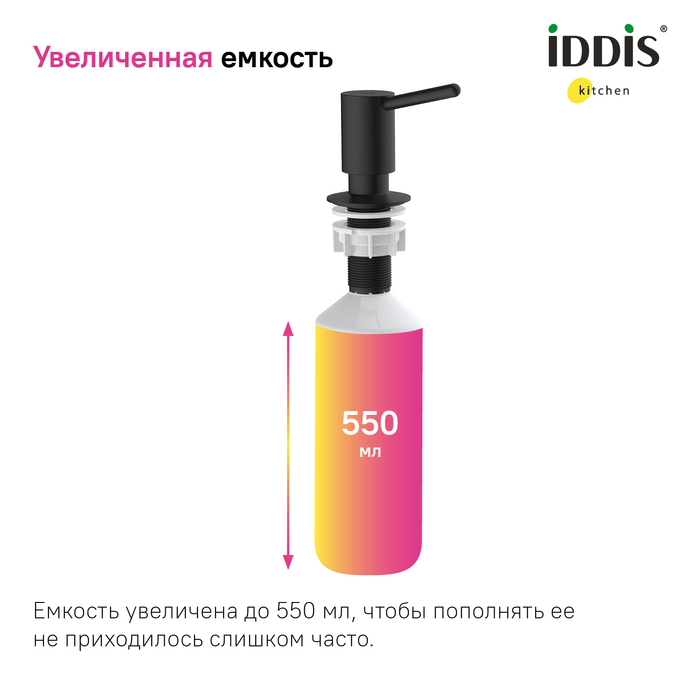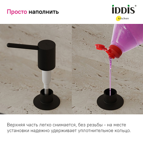 Встраиваемый в столешницу дозатор – незаменимый аксессуар для кухни, где ничто не должно отвлекать от красивого интерьера. Выглядит эстетично и занимает минимум места, освобождая его для действительно важных вещей. Трендовый цвет и универсальный дизайн сочетаются с черными смесителями и мойками IDDIS® и других производителей. Отверстие для установки – 29-37 мм.