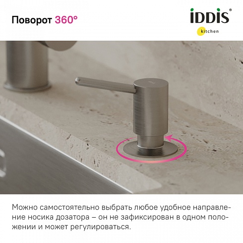 Встраиваемый в столешницу дозатор – незаменимый аксессуар для кухни, где ничто не должно отвлекать от красивого интерьера. Выглядит эстетично и занимает минимум места, освобождая его для действительно важных вещей. Сатиновый цвет и универсальный дизайн сочетаются со смесителями и мойками IDDIS® и других производителей. Отверстие для установки – 29-37 мм.