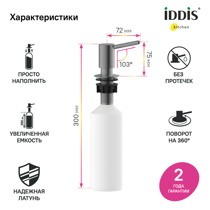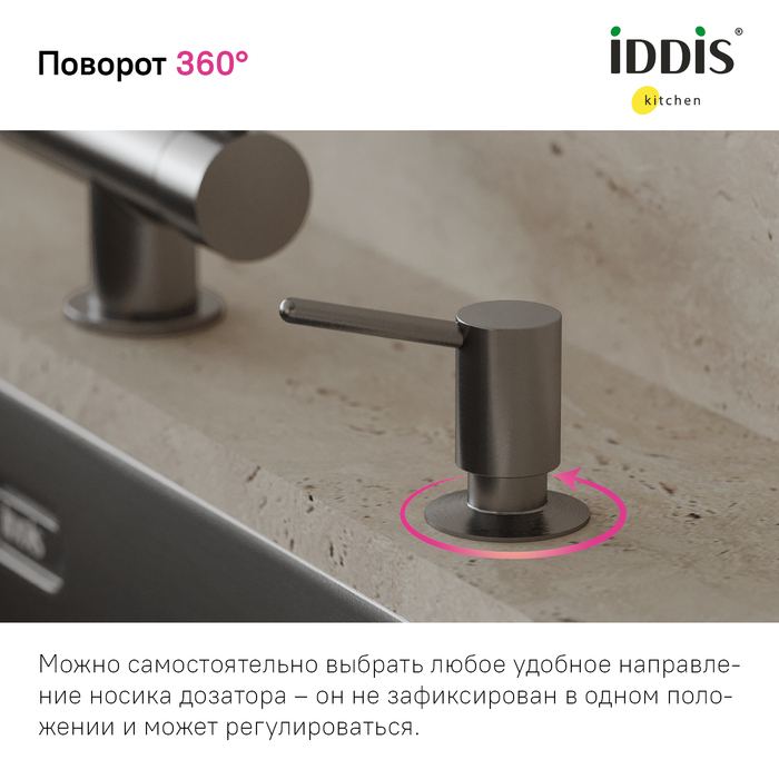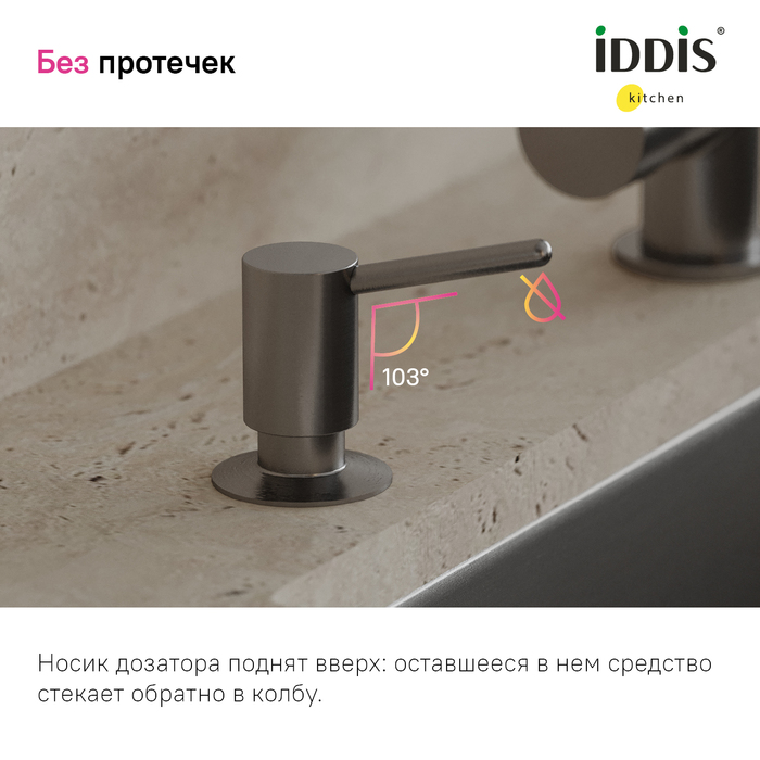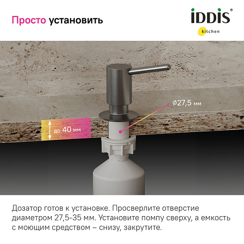 Встраиваемый в столешницу дозатор – незаменимый аксессуар для кухни, где ничто не должно отвлекать от красивого интерьера. Выглядит эстетично и занимает минимум места, освобождая его для действительно важных вещей. Трендовый цвет и универсальный дизайн сочетаются со смесителями и мойками IDDIS® и других производителей в тон. Отверстие для установки – 29-37 мм.