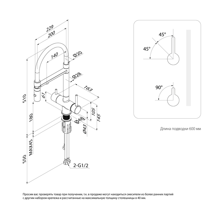 • 2 ручки: для включения фильтрованной воды и для обычной водопроводной (угол открывания ручки – 90 градусов, на себя; может отличаться в зависимости от партии). Фильтр в комплекте не идет и приобретается отдельно.
