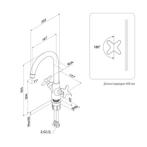 Продуманный синтез классического и современного дизайна элегантно воплощен в строгой форме смесителя для кухни из новой коллекции Acros. Фигурные ручки — модный тренд с тщательно проработанной эргономикой — не только обеспечивают удобную регулировку напора и температуры воды, но и выгодно выделяют новую коллекцию среди множества других. Смеситель может быть установлен как на мойку, так и на столешницу. Благодаря высокому (30 см) изливу пользоваться им удобно на любой кухонной мойке.
