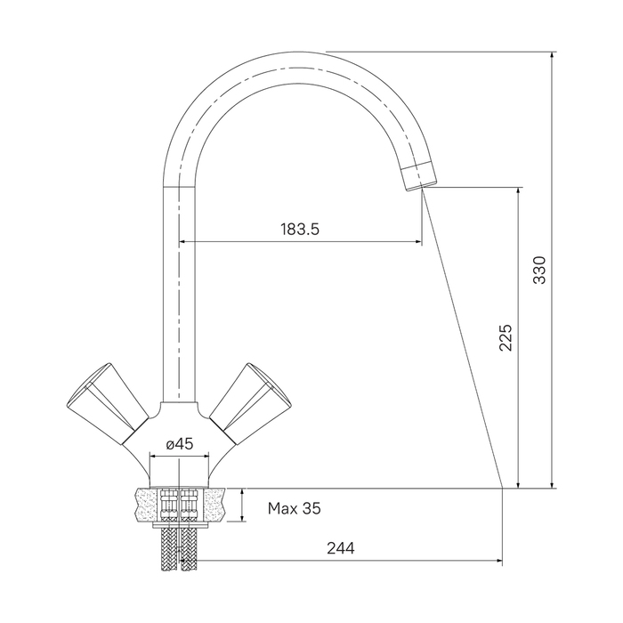 • Подключение к системе водоснабжения Гибкая подводка из нетоксичной EPDM резины в оплетке из нержавеющей стали, М10 - 1/2, длина 350 мм