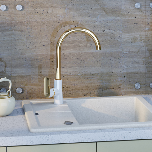 Смеситель для кухни из коллекции Cloud – скромное очарование функциональной роскоши. Элегантное сочетание белого и золотого цветов создает стильный продукт, который подойдет к интерьеру в современном и классическом стиле. Высокий излив (281 мм) поворачивается на 360 градусов, благодаря чему им удобно пользоваться на любой кухонной мойке. В комплекте гибкая подводка и крепеж.