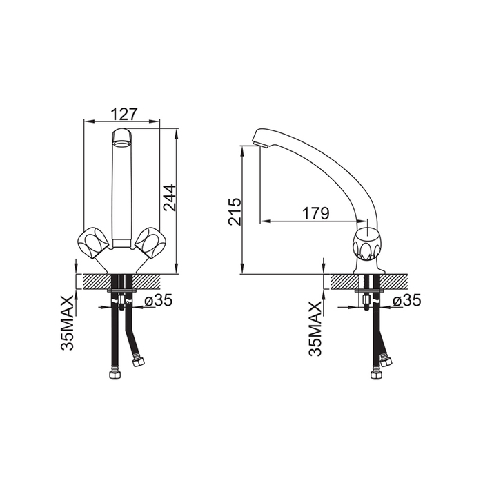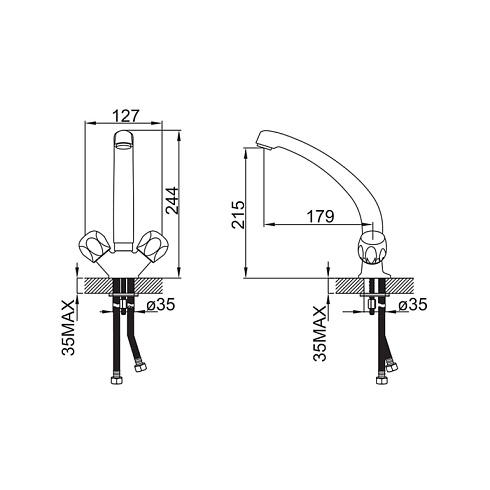 • Подключение к системе водоснабжения Гибкая подводка из нетоксичной EPDM резины в оплетке из нержавеющей стали, М10 - 1/2, длина 350 мм