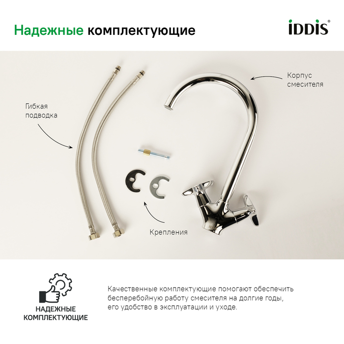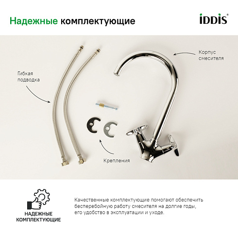 Смеситель для кухни IDDIS® изготовлен из высококачественной первичной латуни, прочной, безопасной и стойкой к коррозии. Инновационные технологии литья и обработки латуни, а также увеличенная толщина стенок смесителя обеспечивают его стойкость к перепадам давления и температур.