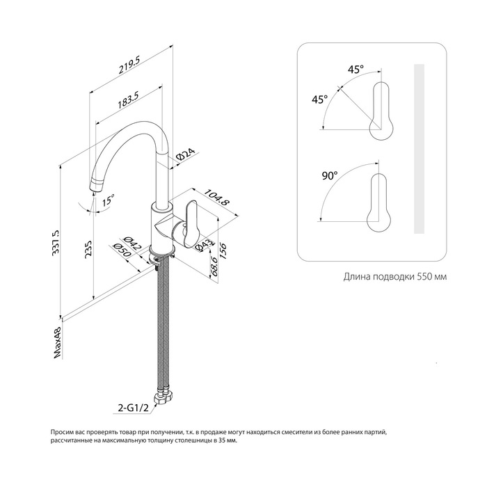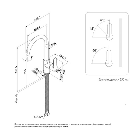• Плавный ход ручки и абсолютная точность регулировки температуры и напора воды — за счет качественного керамического картриджа. Угол открывания ручки – 90 градусов, на себя; может отличаться в зависимости от партии.