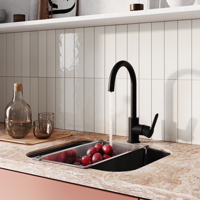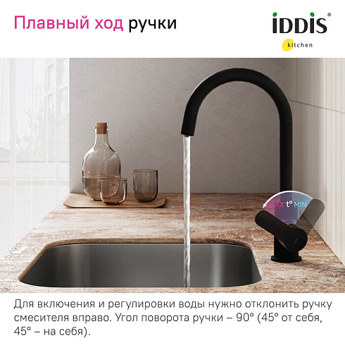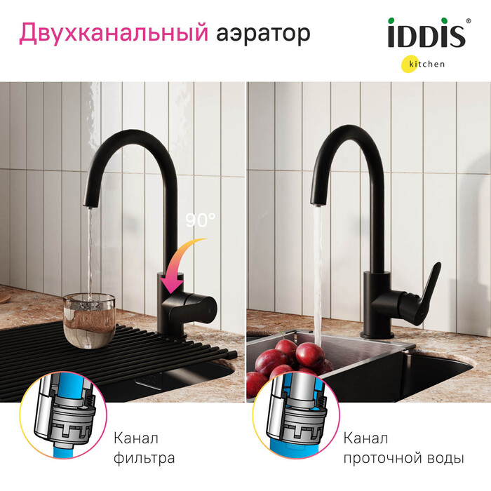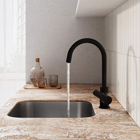 Смеситель для кухни Cuba в трендовом черном цвете с каналом для фильтрованной воды представляет уникальную технологию управления фильтрованной водой, которая практически не имеет аналогов: она включается той же ручкой, что и обычная. Чтобы налить стакан чистой воды, достаточно просто повернуть ручку на себя в закрытом состоянии. Нет необходимости устанавливать отдельный смеситель и сверлить под него отверстие.