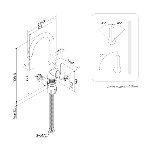 • Высокий поворотный излив делает смеситель более практичным.