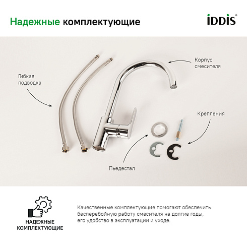 • Смеситель IDDIS® прослужит долго благодаря надежному корпусу из прочной латуни, стойкому к коррозии, резким изменениям давления и перепадам температуры воды.