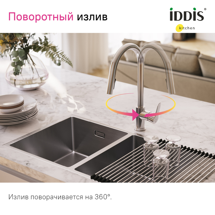 • 2 режима подачи воды: аэрированная струя – для наполнения емкостей и работы в привычном режиме; «душ» – для ополаскивания посуды или мытья овощей и фруктов. Режимы переключаются кнопкой на внутренней стороне излива.