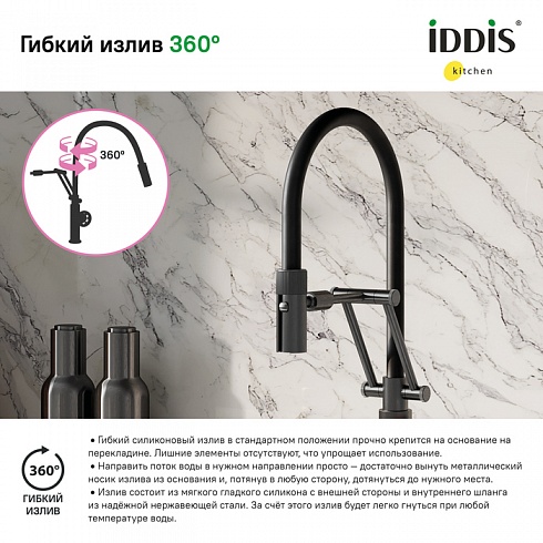• Излив из нержавеющей стали покрыт внешней оболочкой из термостойкого силикона, что позволяет ему гнуться при любой температуре воды.