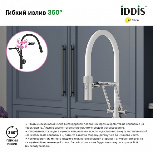 Смеситель для кухни Grange с гибким изливом в ярком индустриальном дизайне и сочетании белого и хромированного цветов. Ручка-шестеренка скрывает привычный однозахватный механизм управления.