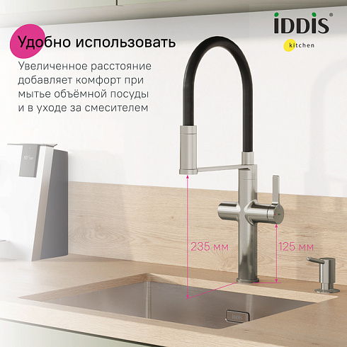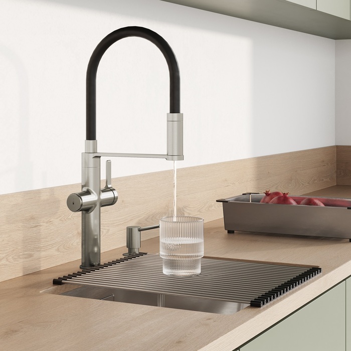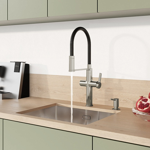 Профессиональный смеситель для кухни Ikon в сатиновом цвете с чёрным гибким изливом и отдельным каналом для фильтрованной воды. Современный, продуманный и функциональный, он успешно справляется с повседневными задачами на кухне.