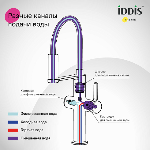 • Встроенный канал для фильтрованной воды – чистая питьевая вода прямо из-под крана. Удобно включается нажатием кнопки. Фильтр приобретается отдельно.