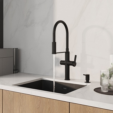 Профессиональный смеситель для кухни Ikon с чёрным гибким изливом и отдельным каналом для фильтрованной воды. Современный, продуманный и функциональный, он успешно справляется с повседневными задачами на кухне.