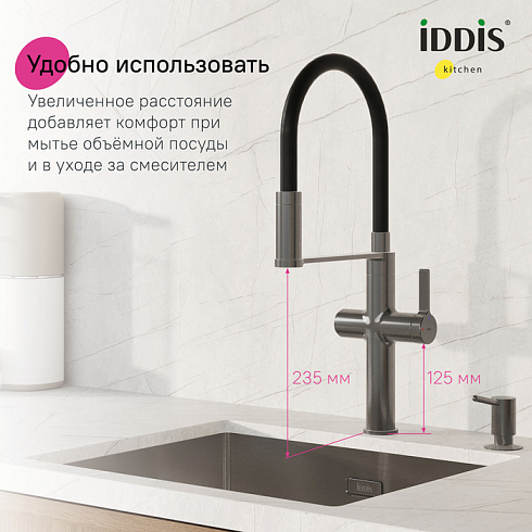 Профессиональный смеситель для кухни Ikon в цвете графит с чёрным гибким изливом и отдельным каналом для фильтрованной воды. Современный, продуманный и функциональный, он успешно справляется с повседневными задачами на кухне