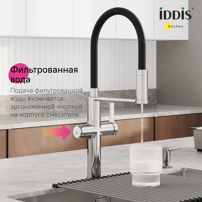 Профессиональный смеситель для кухни Ikon с чёрным гибким изливом и отдельным каналом для фильтрованной воды. Современный, продуманный и функциональный, он успешно справляется с повседневными задачами на кухне.