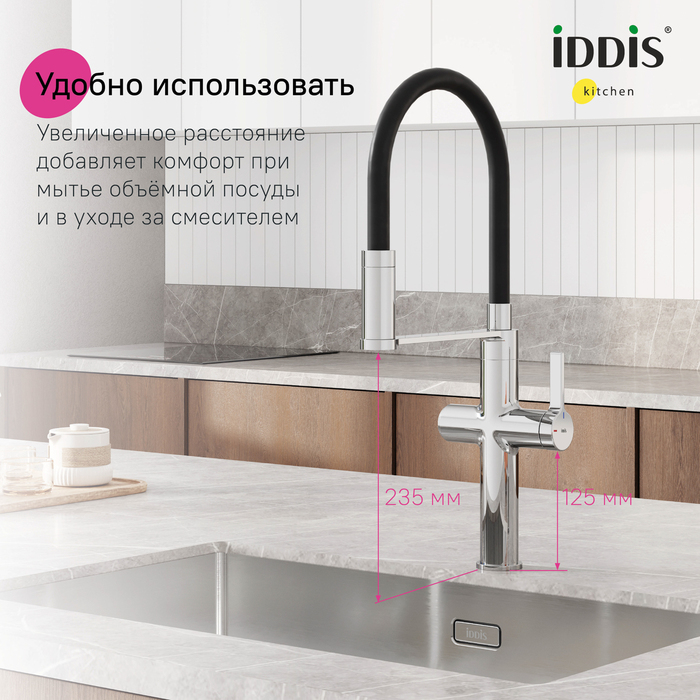 • Гибкий излив позволяет направить струю воды в нужную точку и фиксируется магнитным замком за секунду.