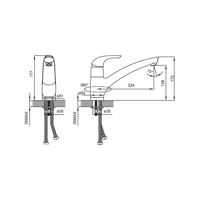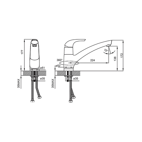 • Подключение к системе водоснабжения Гибкая подводка из нетоксичной EPDM резины в оплетке из нержавеющей стали, М10 - 1/2, длина 350 мм