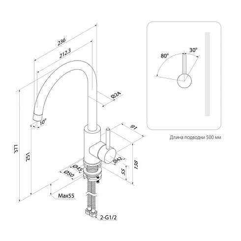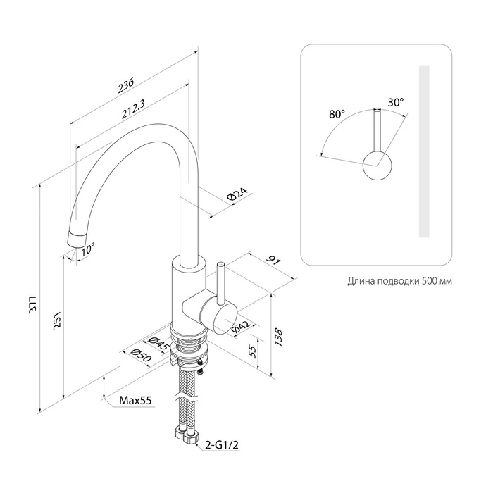 • Угол открывания ручки – 110 градусов (30 градусов от себя – холодная вода, 80 на себя – горячая). Угол может отличаться в зависимости от партии.