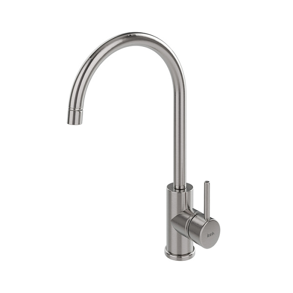 Смеситель для кухни из нержавеющей стали Kitchen универсального дизайна подойдет почти к любому интерьеру. Благодаря высокому поворотному изливу будет удобен в использовании даже с неглубокой мойкой.