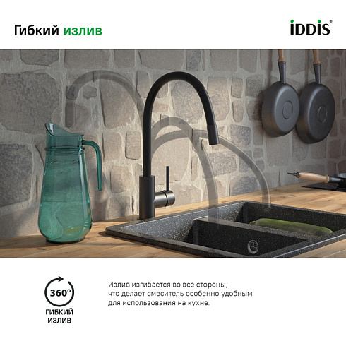 Смеситель для кухни Kitchen 360 в трендовом черном цвете с гибким силиконовым изливом выводит рутинные задачи на новый уровень комфорта: с ним легко промывать овощи и фрукты, наполнять крупногабаритную посуду, мыть мойку. Внутренний шланг из нержавеющей стали с особой системой соединения звеньев придает изливу гибкость и прочность. Он будет держать свою форму, не деформируясь со временем.