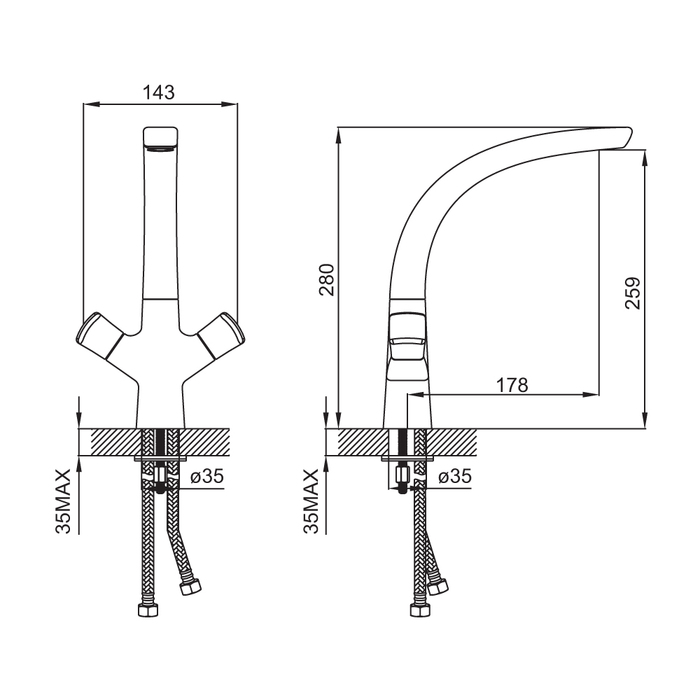 • Подключение к системе водоснабжения Гибкая подводка из нетоксичной EPDM резины в оплетке из нержавеющей стали, М10 - 1/2, длина 350 мм