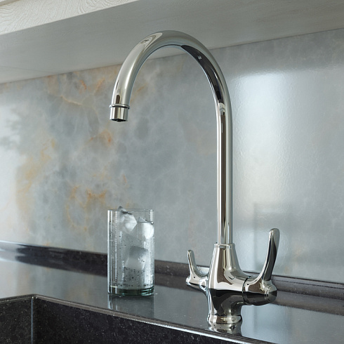 Смеситель для кухни Oldie – превосходное сочетание утонченной формы и современного функционала в ретро стилистике. Со смесителями из коллекции Oldie легко воплотить в жизнь любые дизайнерские идеи – оригинальные детали и корпус, выполненные в популярном цвете хром, легко сочетаются с любыми фактурными поверхностями и интерьерными решениями. Отдельный канал для фильтрованной воды встроен прямо в корпус смесителя, благодаря этому установка дополнительного смесителя больше не понадобится. Канал может быть подключен к любому фильтру. В комплекте гибкая подводка и крепеж.