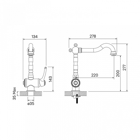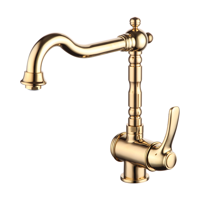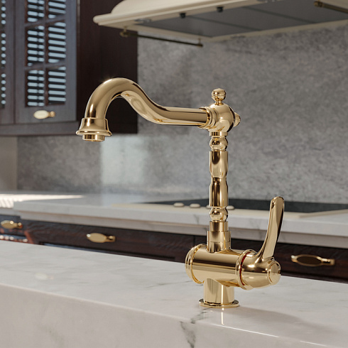Смеситель для кухни Oldie – превосходное сочетание утонченной формы и современного функционала в ретро стилистике. Со смесителями из коллекции Oldie легко воплотить в жизнь любые дизайнерские идеи – оригинальные детали и благородный золотой цвет корпуса легко сочетаются с любыми фактурными поверхностями и интерьерными решениями. Излив поворачивается на 360 градусов, благодаря чему им удобно пользоваться на любой кухонной мойке. В комплекте гибкая подводка и крепеж.
