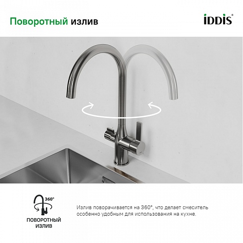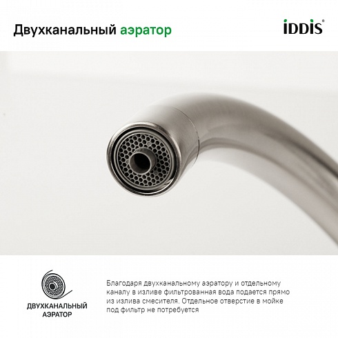 • Не требует дополнительного отверстия в мойке под фильтр. К смесителю можно подключить фильтр любого производителя и наслаждаться чистой водой прямо из смесителя – она удобно включается отдельной ручкой на корпусе.