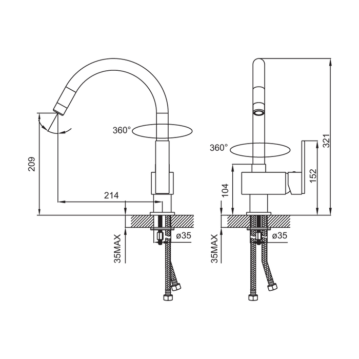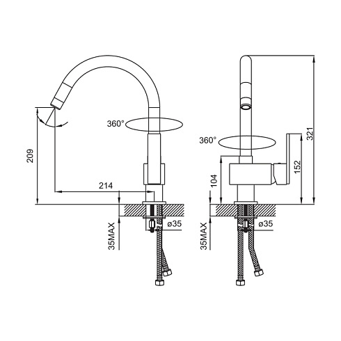 • Подключение к системе водоснабжения Гибкая подводка из нетоксичной EPDM резины в оплетке из нержавеющей стали, М10 - 1/2, длина 350 мм