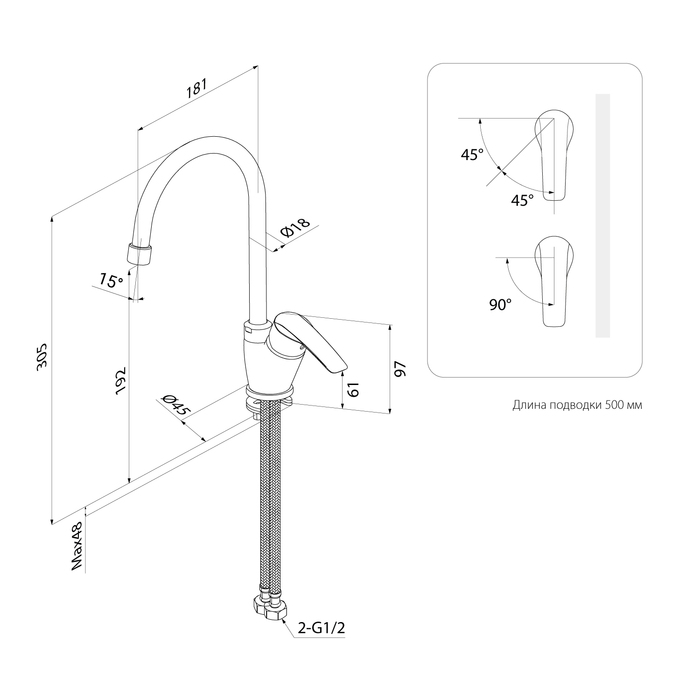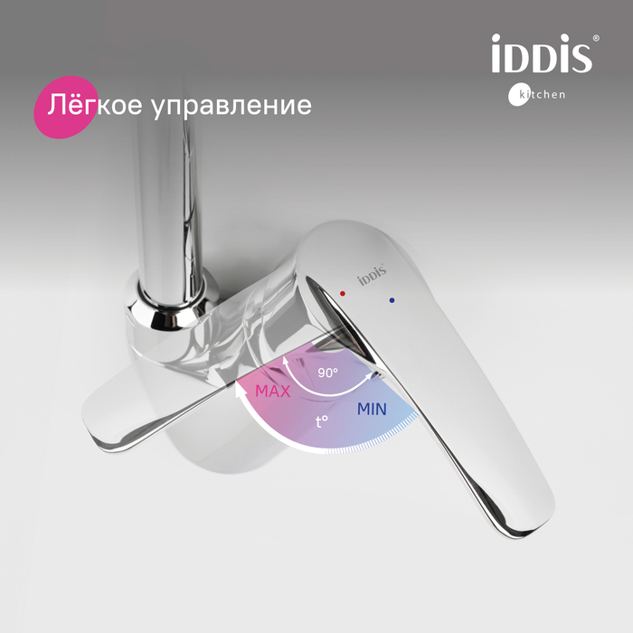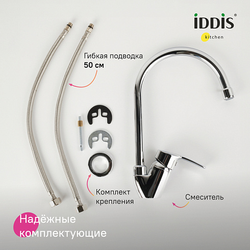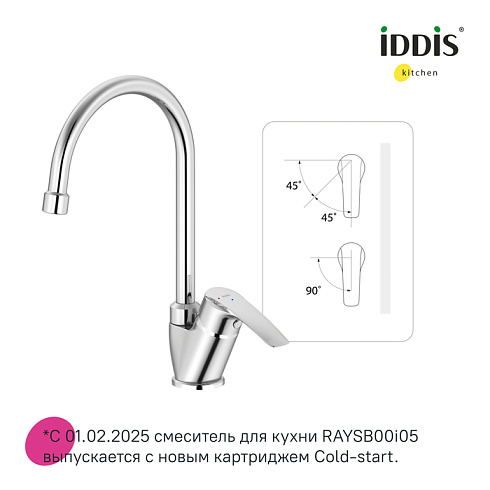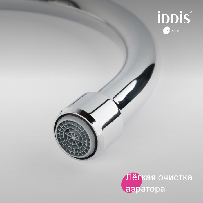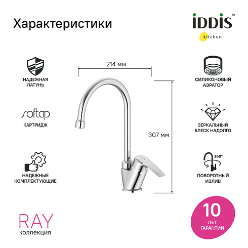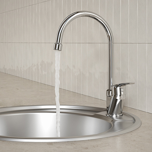 Высокий смеситель (307 мм) для кухни Ray с универсальным дизайном подойдет для разных интерьеров. Благодаря поворотному изливу пользоваться им удобно на любой кухонной мойке. Может быть установлен и на мойку, и на столешницу.
