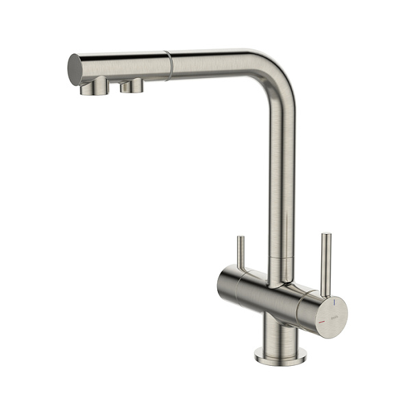 Смеситель Umbra в сатиновом цвете – стильный дизайн и многофункциональность, необходимая на современной кухне. Удобная эргономичная ручка, питьевая вода из отдельного встроенного канала для фильтрованной воды и выдвижной излив – детали, которые сделают ежедневные хлопоты приятными.