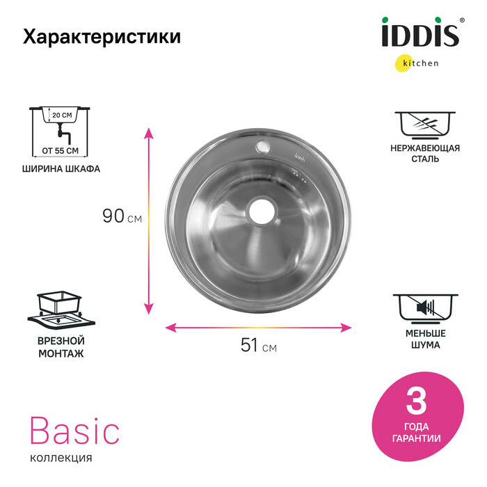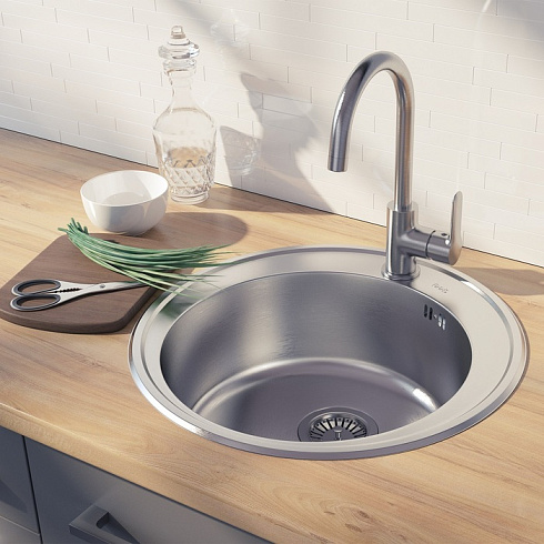 Универсальная мойка Basic – грамотное решение для наполнения эффективного кухонного пространства, отлично подойдет для выполнения повседневных задач на современной кухне. Круглая модель диаметром 510 мм составит комплект с тумбами шириной от 55 см. Матовая сатиновая поверхность мойки Basic гармонирует с различной кухонной утварью и аксессуарами.