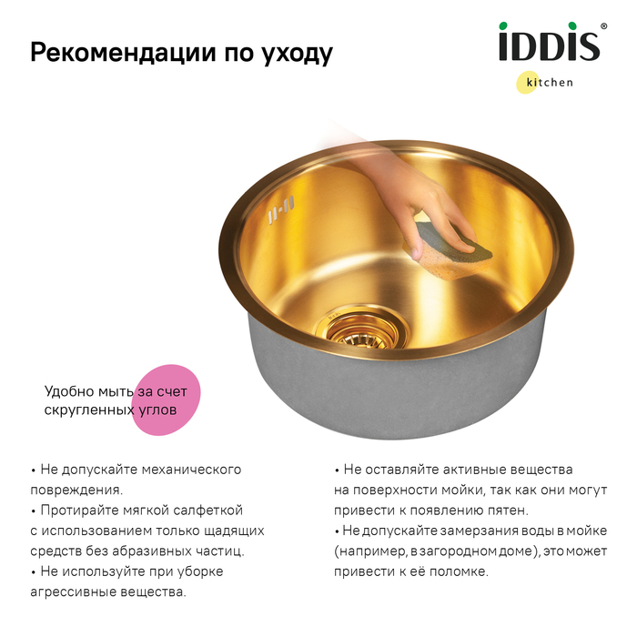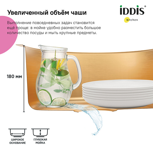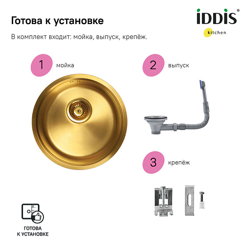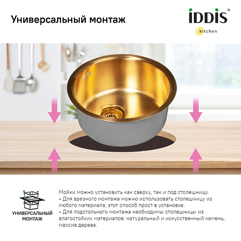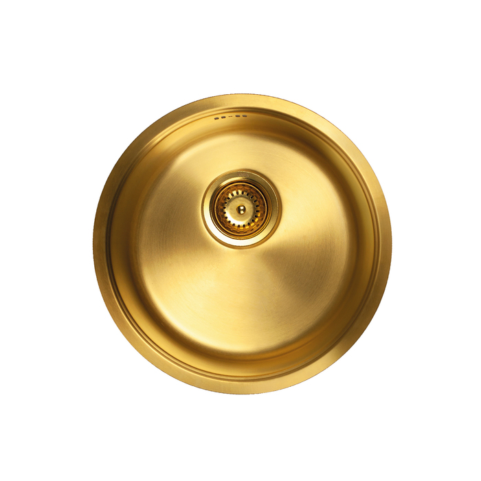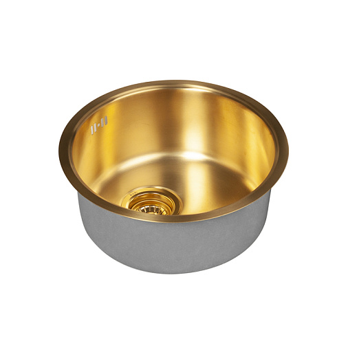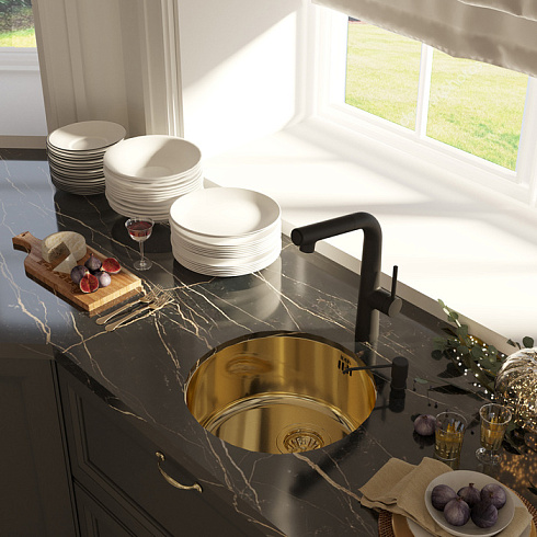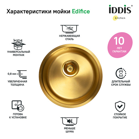 Круглая золотая мойка Edifice перевернет представление о привычных кухонных мойках благодаря современному дизайну и эргономичности, достойных кухни шеф-повара. Для шкафа шириной от 45 см.