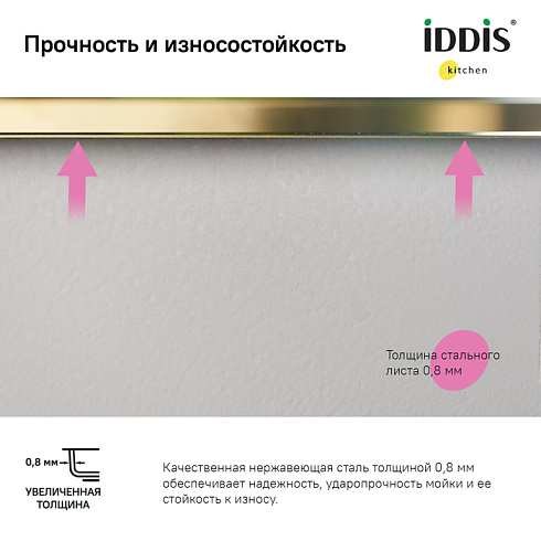 Нержавеющая сталь 0,8 мм обеспечивает надежность, ударопрочность и стойкость к износу.