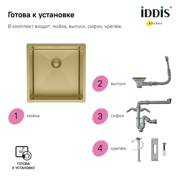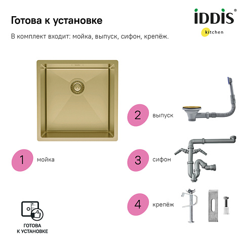 • В комплекте все необходимое: 2 набора крепежей, стильный выпуск, плоский сифон, который занимает меньше места и освобождает полезное пространство. Универсальный монтаж: врезной (вырез под мойку составляет 420х420хR10 мм) и подстольный (вырез под мойку составляет 400х400 мм).