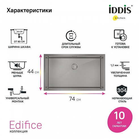 Широкая мойка Edifice в цвете графит перевернет представление о привычных мойках благодаря современному дизайну и эргономичности, достойных кухни шеф-повара. За счет нестандартного размера 700х400 мм ее рабочая поверхность почти равна 2 обычным мойкам. Для шкафа шириной от 80 см. Глубина 20 см.